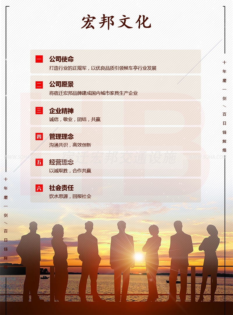 公司以"全心全意讓客戶滿意"為經(jīng)營宗旨,始終堅持以創(chuàng)新為先,市場和客戶需求為導向。多年來,宏邦經(jīng)過不間斷的跨越式發(fā)展,已成為城市街具研發(fā)和候車亭生產(chǎn)行業(yè)規(guī)?;髽I(yè)。
